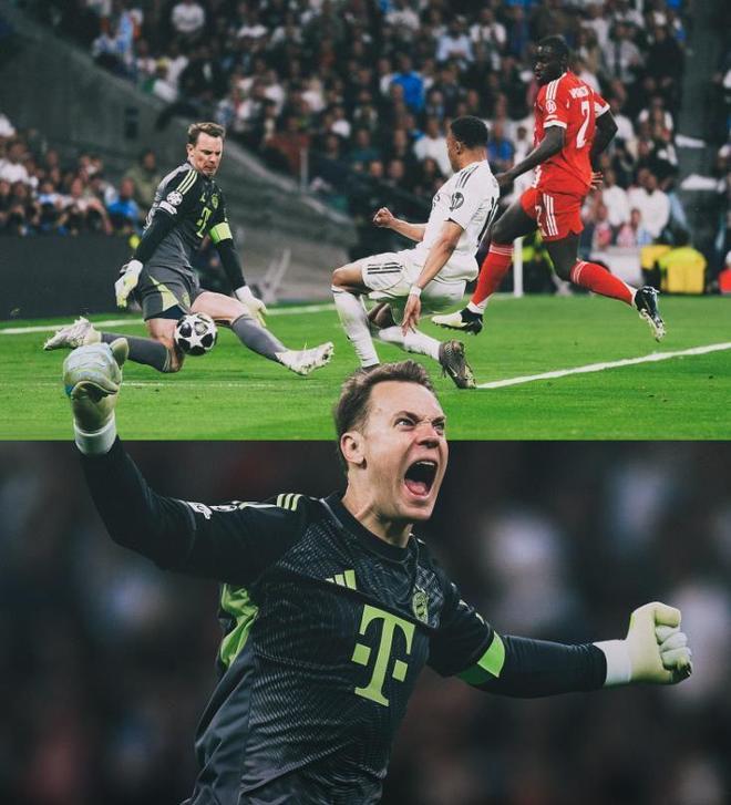 诺伊尔伯纳乌封神!北京时间4月8日凌晨,本赛季欧冠1/4决赛首回合上演了一场万众瞩目的“欧洲德比”,皇家马德里坐镇伯纳乌迎战拜仁慕尼黑。最终,德甲巨人客场2-1力克皇马,终结了长达12年、连续9场欧冠不胜皇马的魔咒。本场比赛的主角,既不是拜仁的进球功臣迪亚斯和凯恩,也不是为皇马续命的姆巴佩,而是那位刚刚伤愈复出、已然40岁高龄的拜仁队长诺伊尔!