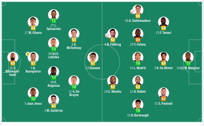 那不勒斯首发:32-瓦尼亚、5-胡安(85'31-别克马)、4-布翁乔尔诺、17-奥利维拉、3-古铁雷斯、68-洛博特卡、99-安古伊萨、37-斯皮纳佐拉(74’21-波利塔诺)、11-德布劳内(85'20-埃尔马斯)、8-麦克托米奈、23-吉奥瓦尼(70’27-阿利松·桑托斯)。