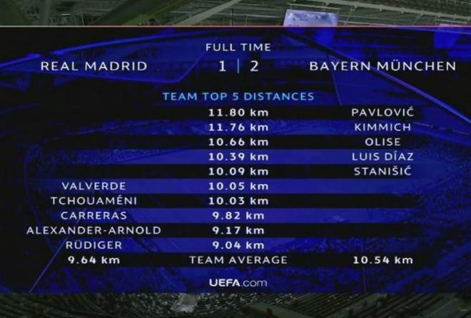 4、跑动数据方面:帕夫洛维奇本场比赛跑动11.80km,成为全场最多的同时,跑动榜前五均是拜仁球员,皇马跑动距离最多的球员,则是巴尔韦德,仅为10.05km……